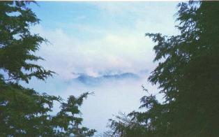 いったん下って自然歩道にもどり先に進むと左手下に避難小屋が見えます。 八丁坂ノ頭につく頃にはかなりグロッキーです。 姫次の少し手前の東海自然歩道の最高地点(1433m)に13時45分に到着、かなり遅い昼食をとりました。 |